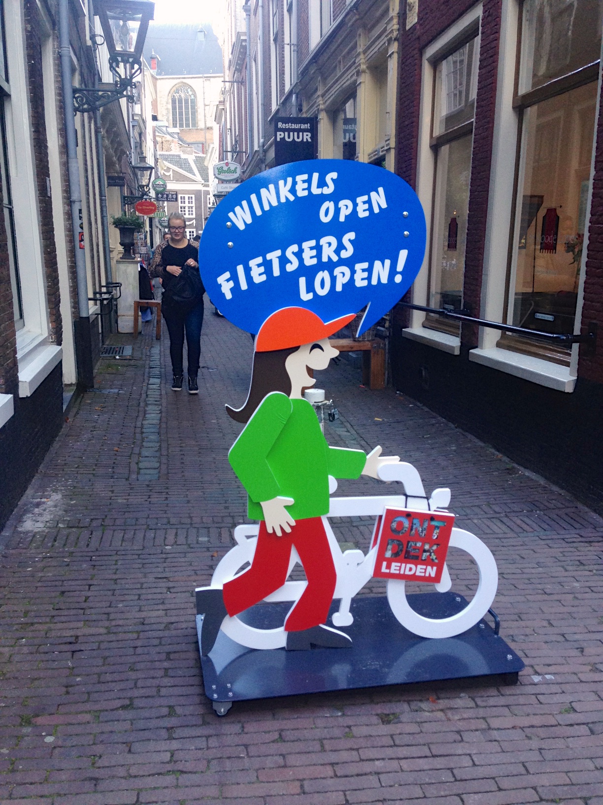 Te voet in de stad is niet altijd makkelijk. Je moet tegen dat gemotoriseerd verkeer op — daarover zal hier later nog veel verschijnen — maar ook de relatie met fietsers ligt hier en daar moeilijk. In het algemeen heb ik de indruk dat fietsers zich in Nederlandse binnensteden (in vergelijking met Vlaamse steden) vriendelijker opstellen tegenover voetgangers met wie ze autovrije straten delen. Toch vond men dit opvallende sta-in-de-weg bord wel zinvol, daar aan de Pieterskerk-Choorsteeg te Leiden. Zijn de winkels open? Dan gaan de fietsers lopen — wij in Vlaanderen zouden ‘stappen’ zeggen. Overigens is dat het straatje waar je het best eet in Leiden, minstens wat prijs-kwaliteit aangaat. In die steeg is namelijk Café Brasserie Noroc gevestigd, een absolute aanrader. Bezoek het te voet, of eventueel met de fiets aan de hand…