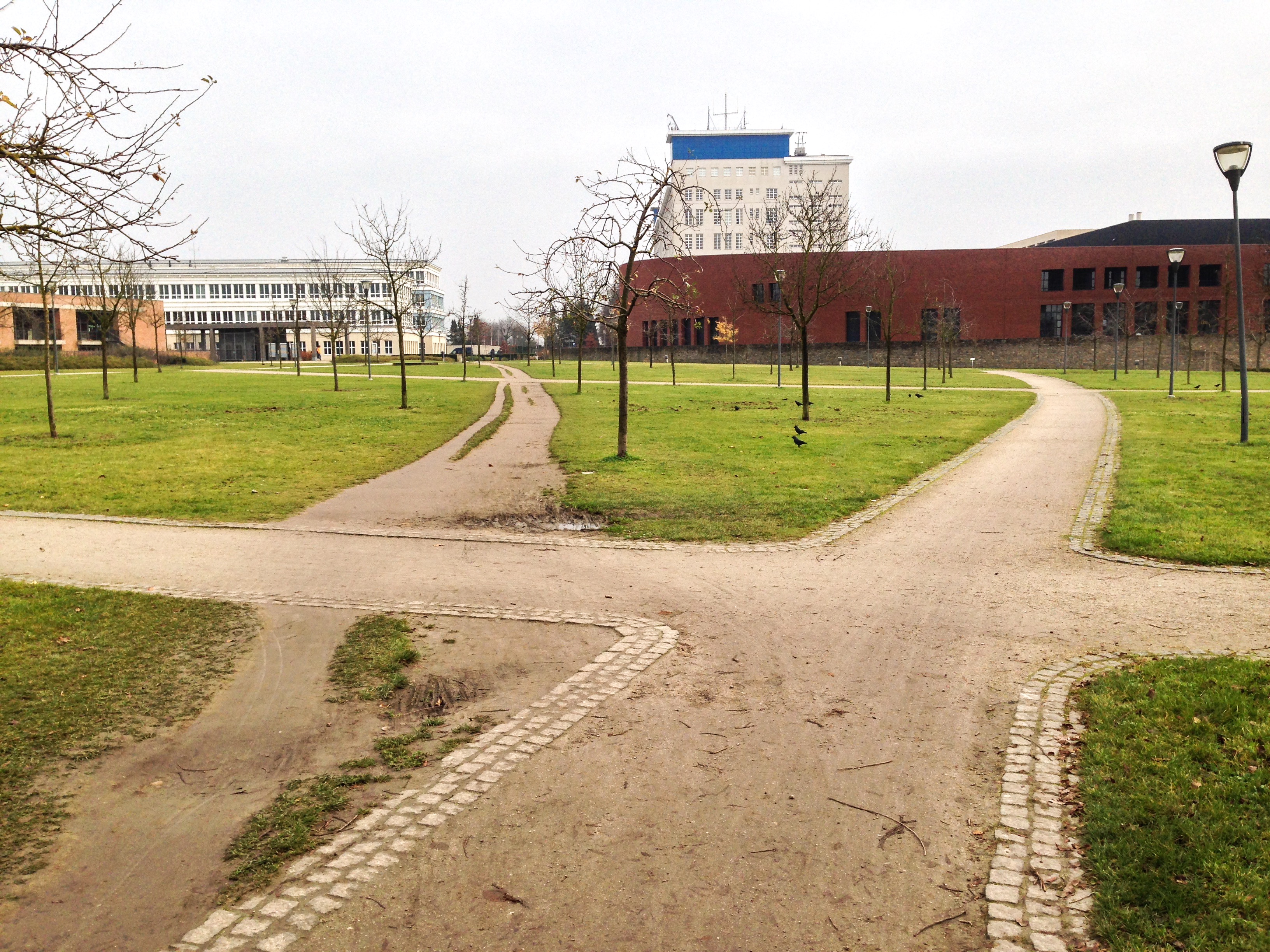 Een voetganger gaat van A naar B in rechte lijn. Deze foto nam ik een paar weken geleden hier in Leuven. Met mijn rug naar de stad en de Parkpoort, kijk ik in de verte naar de gebouwen op de zogenaamde Philipssite. Van links naar rechts zie je er ongeveer een kinderopvangcentrum, een politiekantoor, kantoorgebouw met Philipsblauw, en de ellipsvormige Sportoase met zwembad. Het terrein voor die drukbezochte site werd aangelegd volgens een strak geometrisch plan, dat helaas geen rekening houdt met de meest normale manier waarop fietsers en voetgangers zich verplaatsen. Je ziet het aangelegde pad naar rechts afbuigen, naar een muur, en links zie je het pad dat fietsers en voetgangers spontaan gebaand hebben. Geweldig! Dit wordt ook wel een olifantenpad genoemd (olifanten zijn slimme dieren, ze nemen altijd de kortste weg); in het Frans is het een ezelspad, of een Pad van Verlangen; in het Engels is het een geitenpad. Naar zo’n paadjes wordt ook verwezen met het woord dat ik zelf het leukst vind: ‘stigmetrie’ — de studie van de manier waarop mieren hun weg banen. Van de dieren kunnen we nog veel leren.