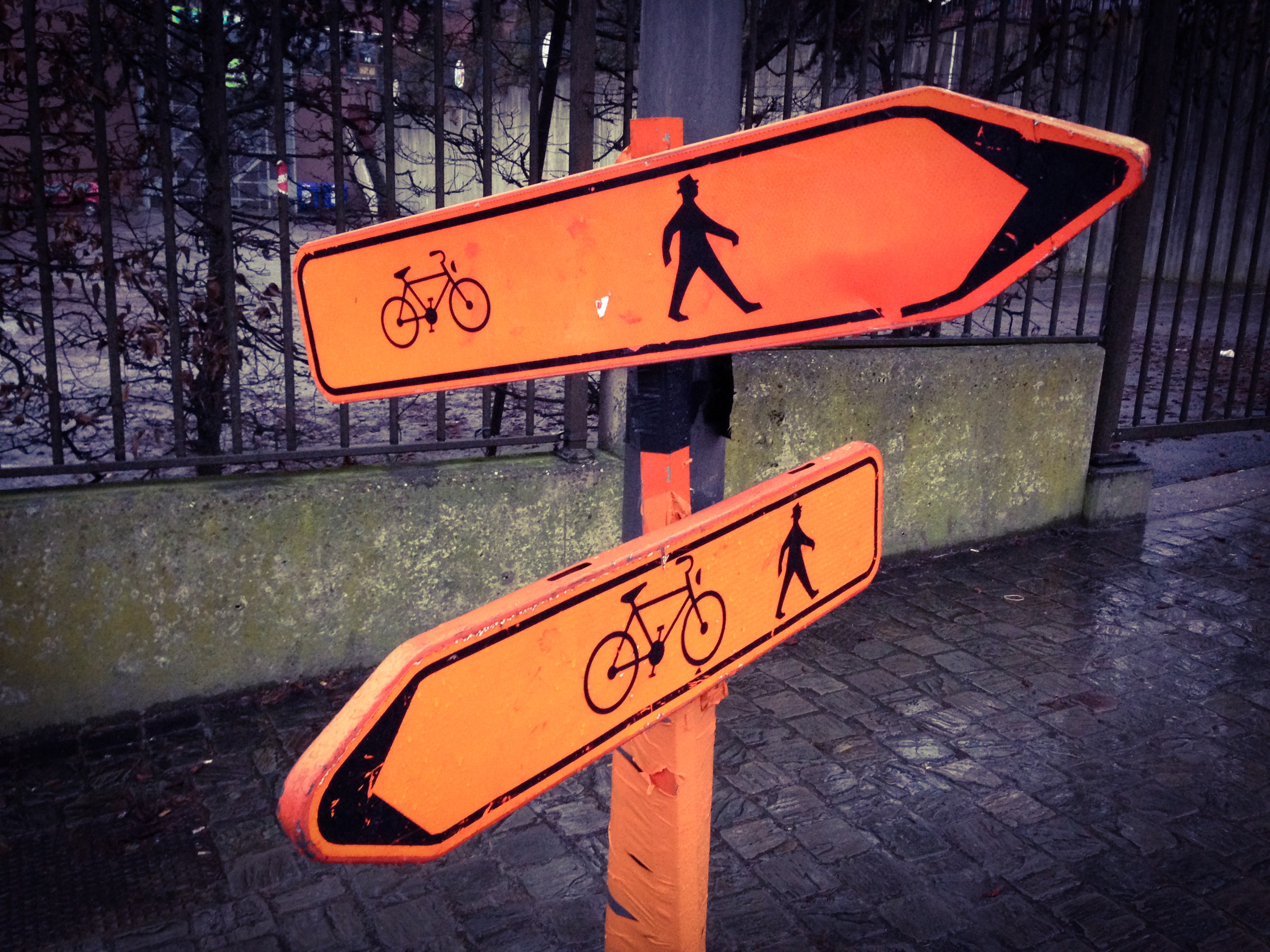 Er is een spreekwoord over Rome en de wegen er naar toe. Dit is er een illustratie van. Ik denk dat het goed bedoeld is, maar vind het toch een beetje zinloos. Niettemin veel dank aan wie dit in elkaar knutselde, ik vind dat het een leuke foto oplevert. Merk overigens op hoe fiets en ‘behoede’ voetganger op beide pijlen dezelfde richting uit stappen. Dat maakt het helemaal grappig!