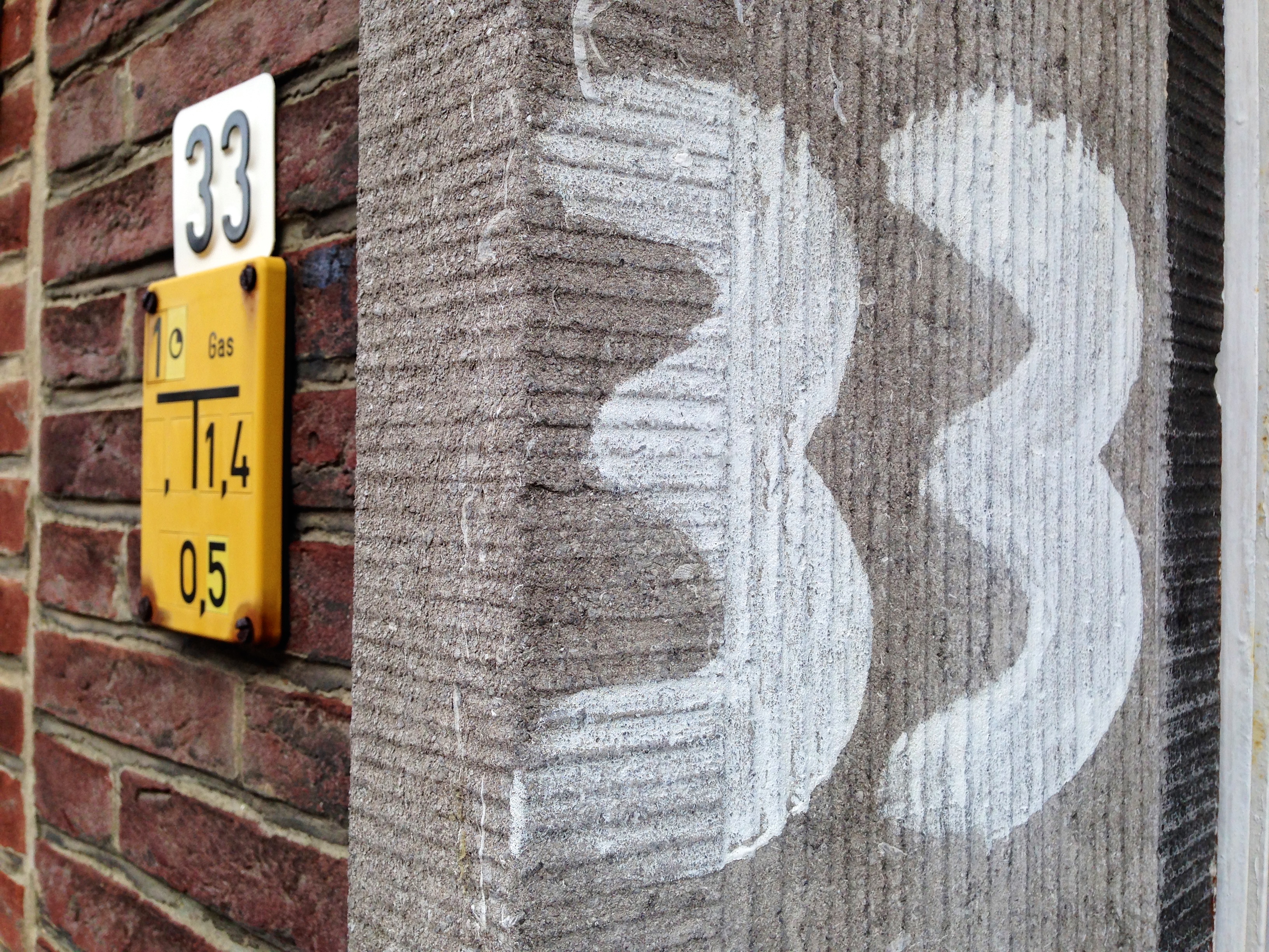 Hier vond een verwoedeling dat zo’n onooglijk huisnummerplakkaatje de postbode en andere brievenbusbedienaars onmogelijk voldoende van huisvinddienst kon zijn. Dan maar met driedubbeldikke borstel de ’33’ op de arduin kladden. Arduinbekladdingsnoestheid. Dat gele plakkaatje daar links geeft aan waar de gasaansluiting onder de stoep zit. Het is een gasaansluitingsplakkaatje. (Een halve meter voor de gevel, en 1,40 meter naar rechts.)