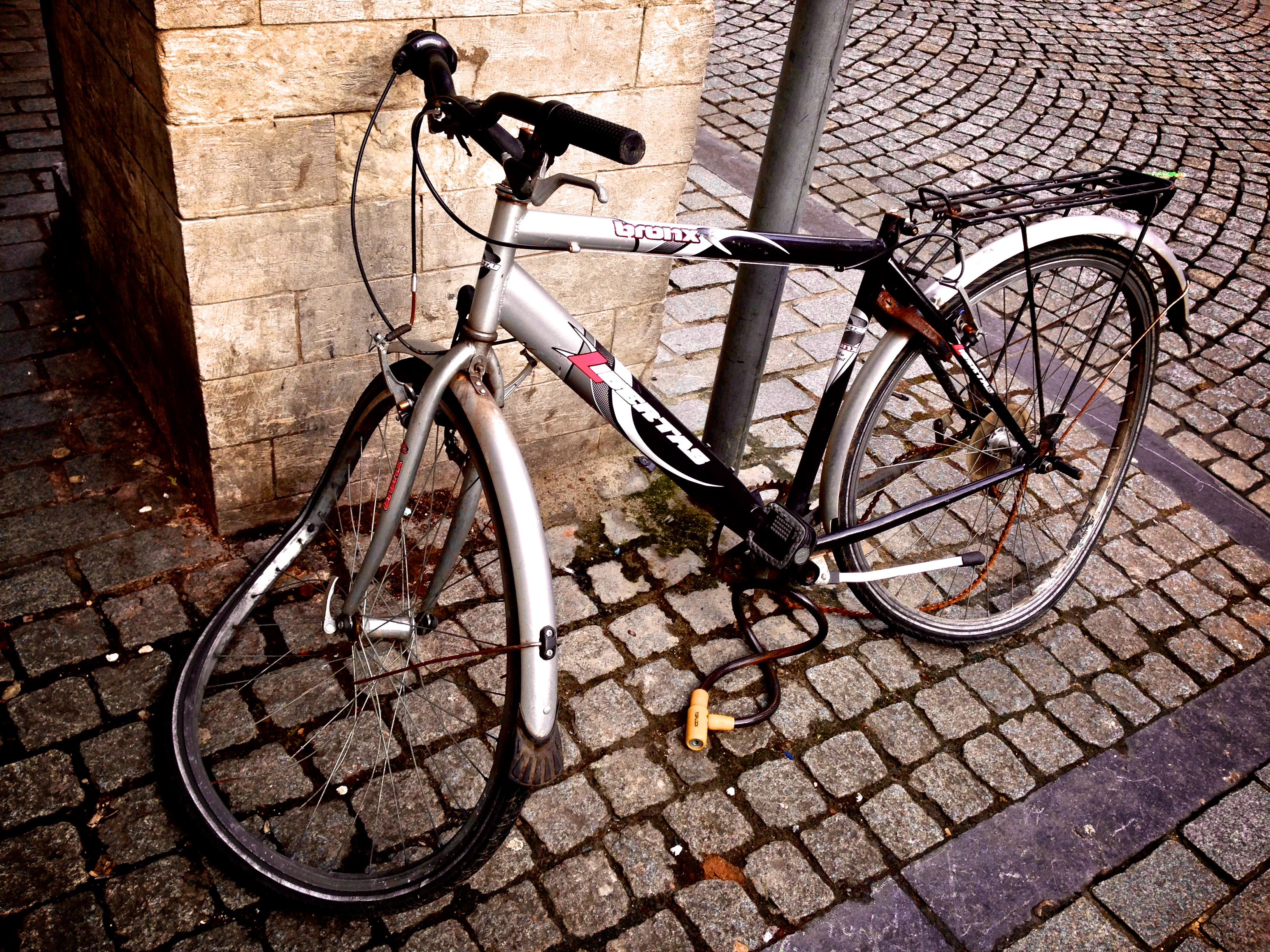 Dit zie je vaak, zeker in een studentenstad als Leuven. Ik vraag me daarbij altijd af hoe zoiets toch gebeurt, hoe het mogelijk is dat een fiets zo moet eindigen. Onlangs zag ik een groepje halfdronken studenten lopen — althans, het waren jonge twintigers, geen idee of het echt studenten waren. Laat ons zeggen een stuk of vijf luidruchtige jonge mannen. Ze liepen voor me uit op de stoep aan de overkant van de straat, en één van hen had een daar tegen de muur gestalde fiets vastgenomen en was er iets mee van plan dat volgens mij niet goed zou geweest zijn voor die fiets. Een andere kerel kon hem van die baldadigheid weerhouden. Waarschijnlijk was die andere kerel een fietser, die ooit al eens bij zijn geparkeerde fiets aangekomen zoiets als dit mocht meemaken — fietser wordt veroordeeld tot voetganger. Allemaal aan de plooifiets, en overal op zak houden? Of gewoon: stappen! Te voet in de stad beleef je de mooiste dingen. Maar niet altijd letterlijk mooi.