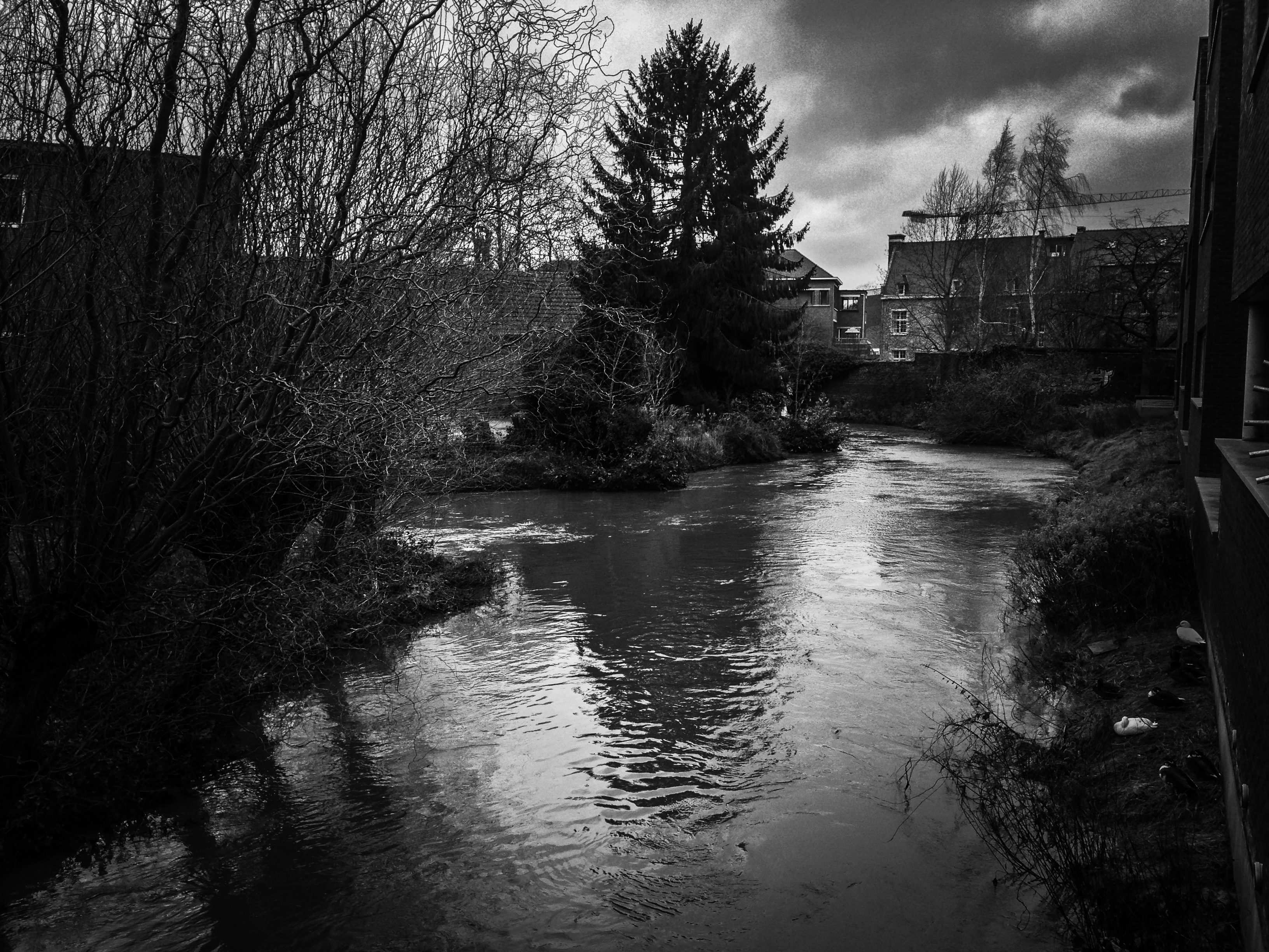 Leuven zit vol Dijle. De rivier kronkelt door de stad van zuid naar noord, met zo’n drie keer een ontdubbeling. Dit is een foto van de hereniging van de eerste ontdubbeling: de Dijle is in het Groot Begijnhof op spectaculair dwarse wijze aan een vertakking naar het oosten begonnen, loopt parallel met de hoofdtak naar het noorden, maakt nog even een flauwe bocht verder weg, om dan recht op doel een dramatische bocht van de moederloop te gaan vervoegen. Ik sta op het brugje in de Redingenstraat (zie plannetje, onder de rode pijl) en ik kijk naar het punt van hereniging (zie de richting van de pijl). Het is een ietwat dramatische foto, met dat zwart en die donkerte. Het was dan ook een donkere, natte dag gisteren. De Dijle kan flauw en ondiep zijn, maar als er veel regen is geweest, dan kan ze echt gaan denderen. Dan staat ze hoog en is op sommige plaatsen best onstuimig, je zou er niet in willen gaan zwemmen. De eendjes rechts maken zich niet druk. Op de achtergrond rechts de gebouwen van het Iers College. Het schiereilandje links is beroemd: daar logeerden een tijd geleden een paar bevers.