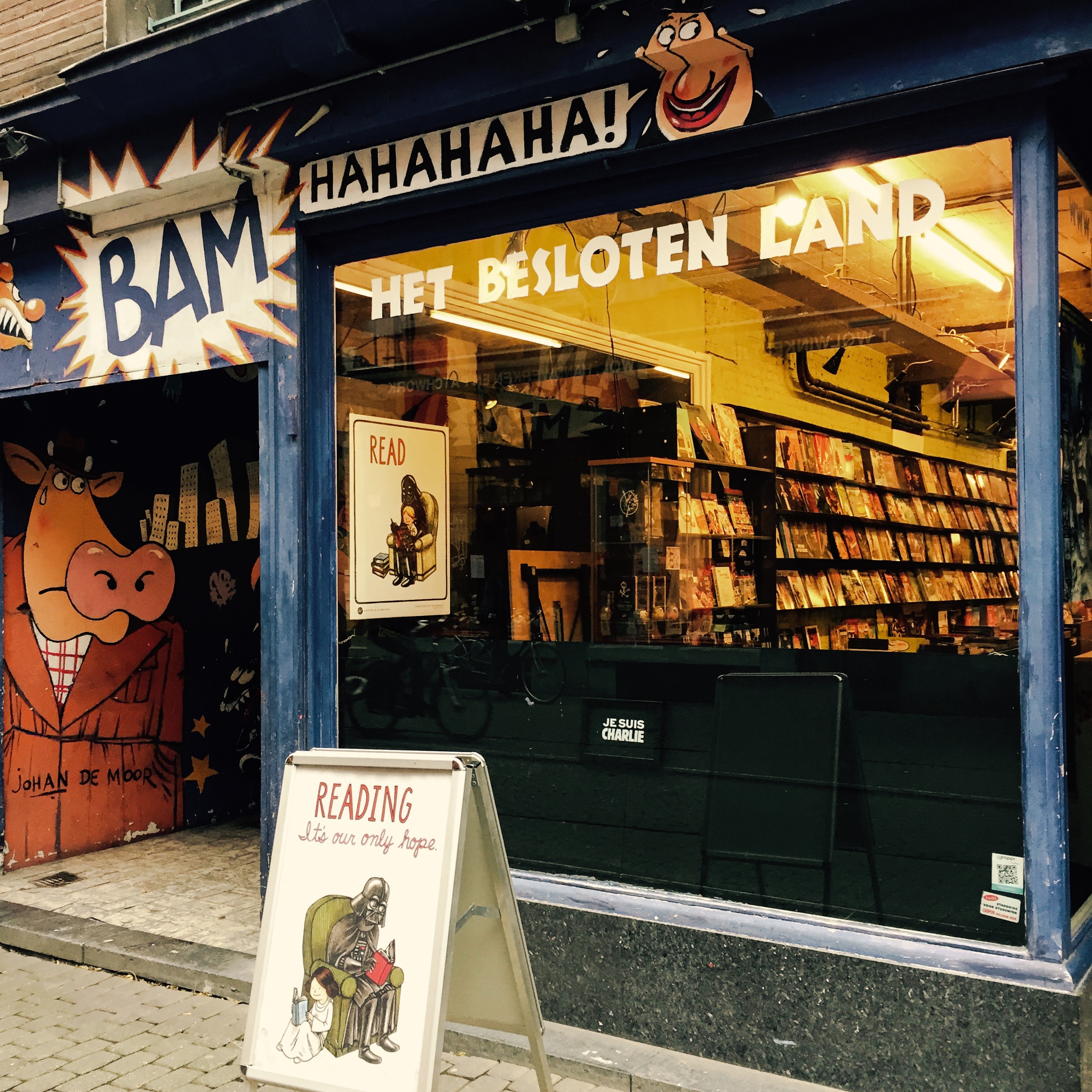De uitbaters van deze stripwinkel haalden vorige week hun etalage helemaal leeg. Er bleef alleen nog een zwart bordje over, met de bekende witte letters ‘Je suis Charlie’. Het bord op de stoep staat er al veel langer. Het bevat een boodschap die in deze context wel relevant is, vind ik: ‘Reading, it’s our only hope’.