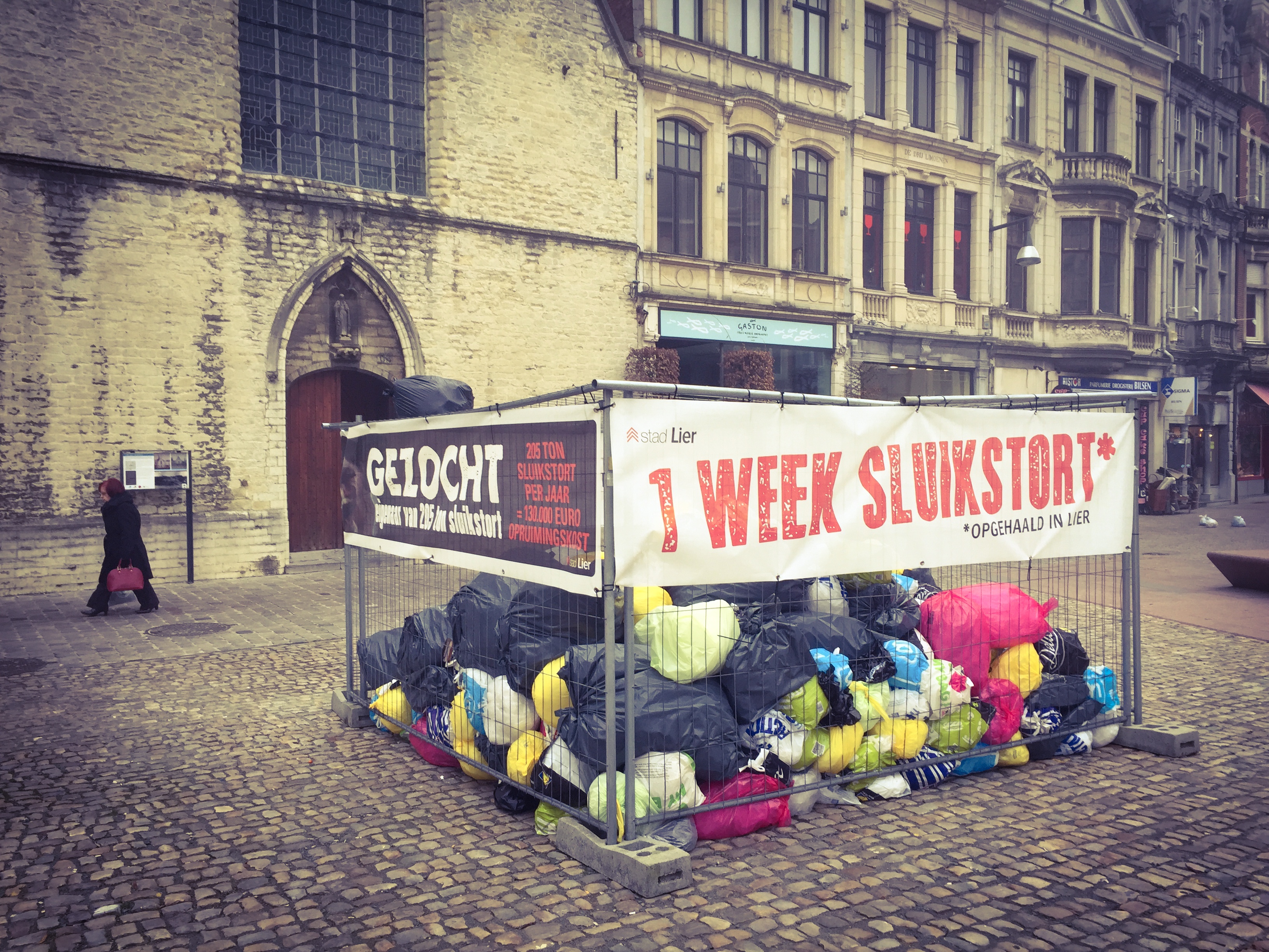 Stad Lier heeft terecht besloten tot een beetje sensibilisering rond sluikstorten. Twee-honderd-en-vijf-duizend kilo sluikstort wordt er jaarlijks opgehaald. Dat dat aan opruimen honderd-dertig-duizend euro per jaar kost, vind ik eigenlijk nog niet eens het belangrijkste probleem — het is dan ook maar één van de argumenten tegen de kwalijke gewoonte niet zelf voor je afval te zorgen. Hier laat de stad zien hoeveel afval er gemiddeld links en rechts gevonden en opgehaald wordt per week. Misschien wel goed om hierop eens de aandacht te vestigen, al ontpopt het stadsbestuur zelf zich met deze actie tot opper-sluikstorter. Wat mij op deze foto intrigeert (na de feiten, zag het niet toen ik de foto nam), is dat er rechts op de achtergrond, op de stoep voor drogisterij Bilsen, drie kleine afvalzakjes lijken te liggen. Ik denk niet dat dat onderdeel is van deze installatie?
