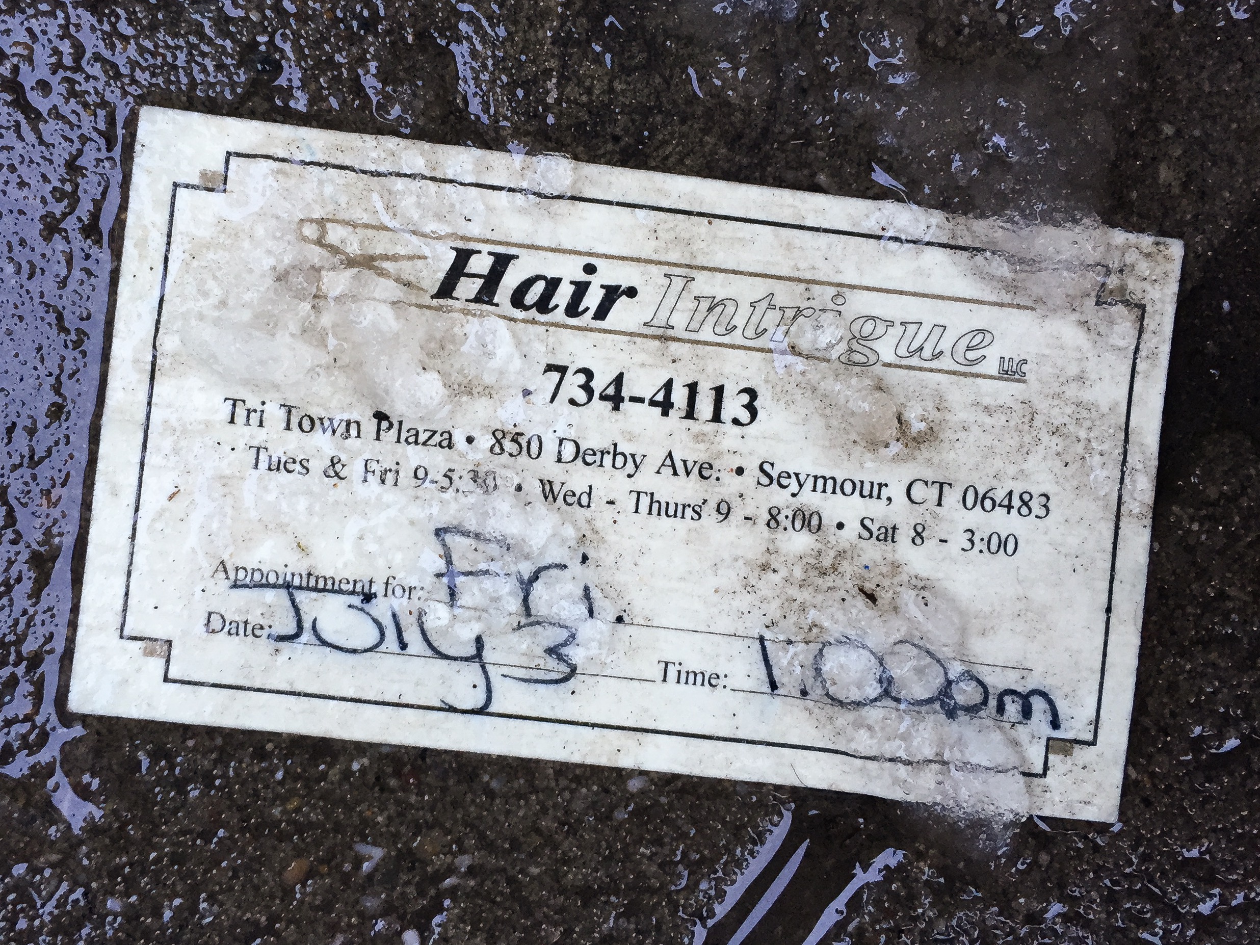 Intrigerend: een afsprakenkaartje van Hair Intrigue. Dit kapsalon, gerund door ene Kathy, is gevestigd in het Tri Town Plaza winkelcentrum aan de Derby Avenue in Seymour, Connecticut, Verenigde Staten. Het stadje is klein, 16.000 inwoners, en het ligt op de plek waar twee rivieren met poëtische namen samenvloeien: de Naugatuck en de Housatonic.