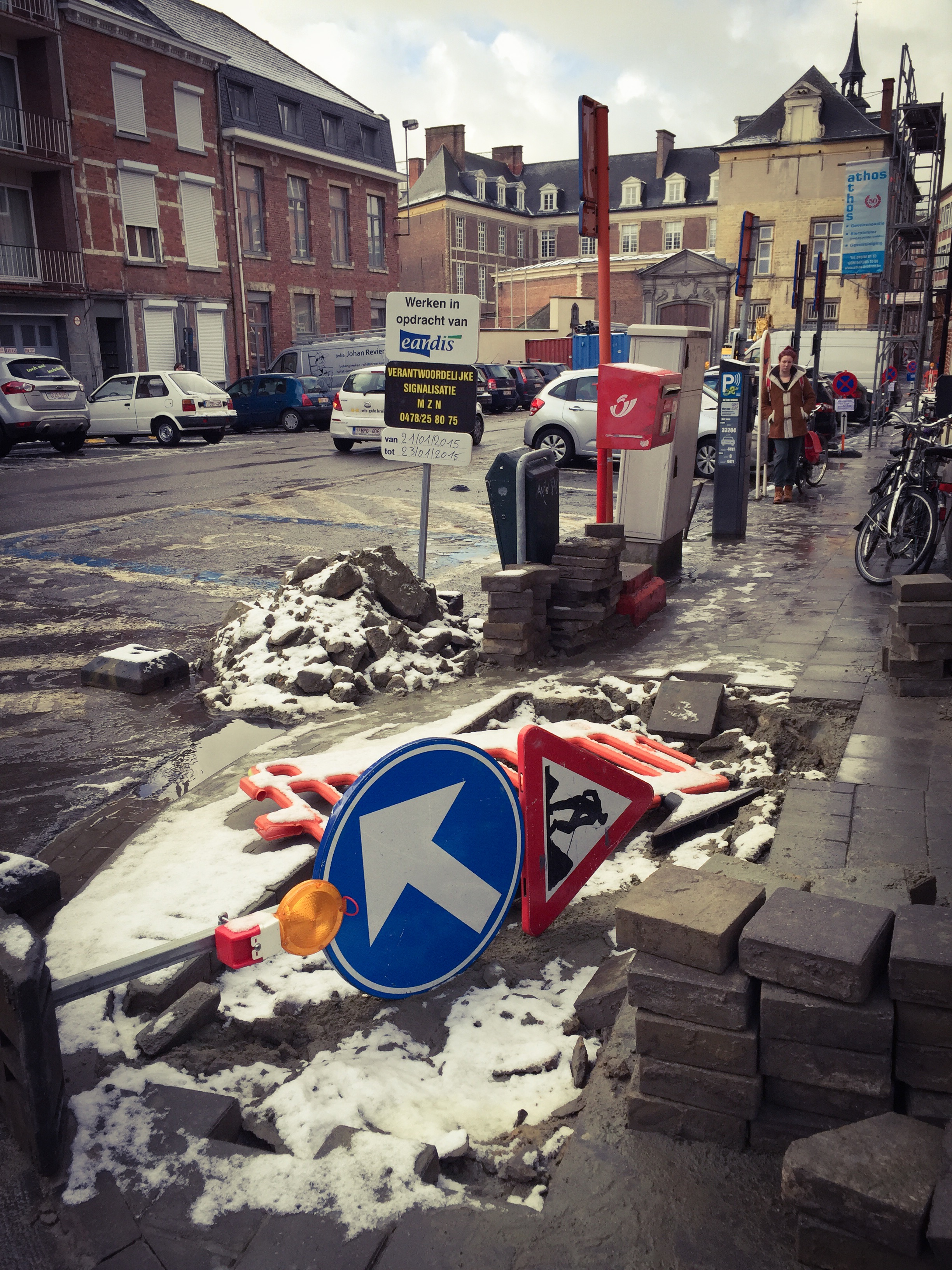 Tja. Wat kunnen we hierover zeggen? Een voetganger wordt meestal niet in de watten gelegd, al helemaal niet als de stoep opgebroken wordt. Dit is op het Damiaanplein in Leuven, en dit hoekje passeer ik dagelijks. Daar zit allerlei in de grond dat maar niet in orde geraakt, lijkt het wel, want ik heb het gevoel dat die plek om de paar maanden opengelegd wordt. In de diepte van de foto zie je een jonge vrouw tegen een Cambio-bord geleund staan — vermoedelijk staat ze op iets of iemand te wachten. Of misschien vraagt ze zich net als ik enigszins verbouwereerd af, hoe het toch mogelijk is dat een stedelijke stoep zo’n troep kan worden.