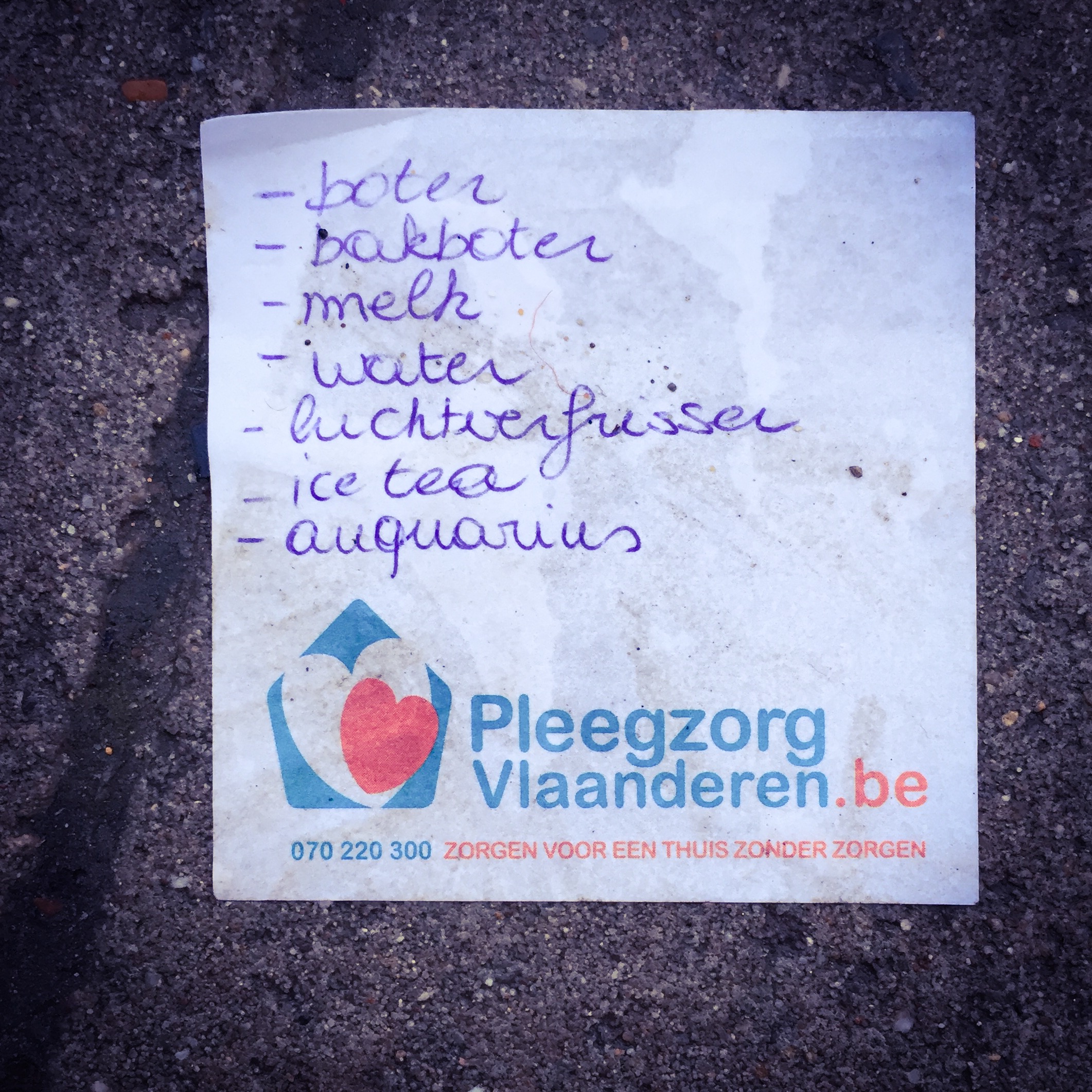 Paarsgewijs opgelijst: boter en bakboter; melk en water; Ice Tea en Aquarius — weliswaar als Auquarius geschreven. Met dat alles samen toch ook behoefte aan luchtverfrisser.