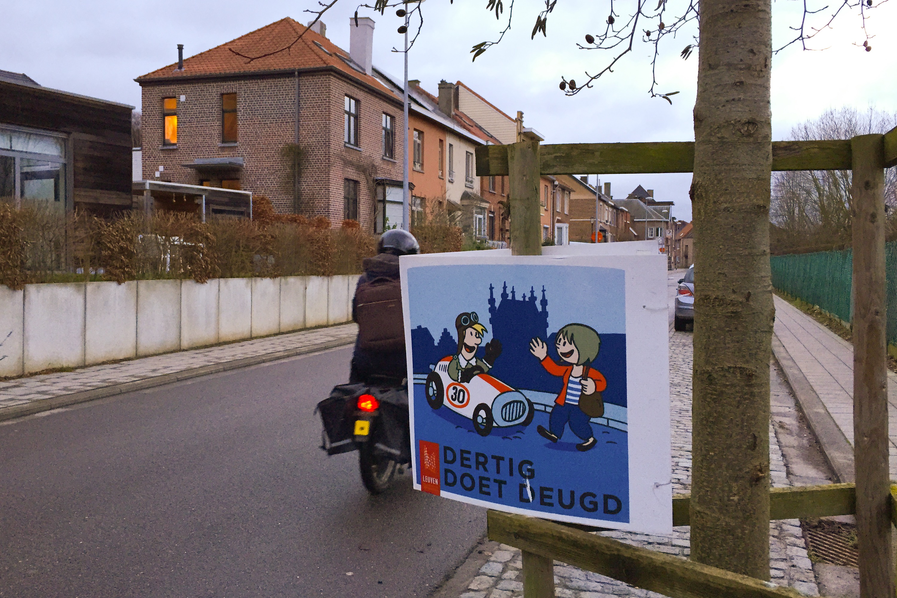Toen in de Stad Leuven zone 30 werd ingevoerd, nog maar in 2011, verschenen hier en daar in de stad deze borden. In de buitenwijken van de stad is de zone 30 nog recenter ingevoerd, vandaar dat er ook nu nog zo’n leuke tekening van de vrolijk-hoffelijke samenleving van automobilist en voetganger te vinden is. Helaas is de situatie van de voetganger er net op achteruit gegaan. Je moet namelijk voor het oversteken van de straat meer dan ooit op de hoffelijkheid van de autobestuurder rekenen, maar die heeft je doorgaans ‘niet zien staan’. Bij afwezigheid van zebrapaden heb je ook moeilijke situaties met het tegenliggend verkeer, als je dan al eens overgelaten wordt.