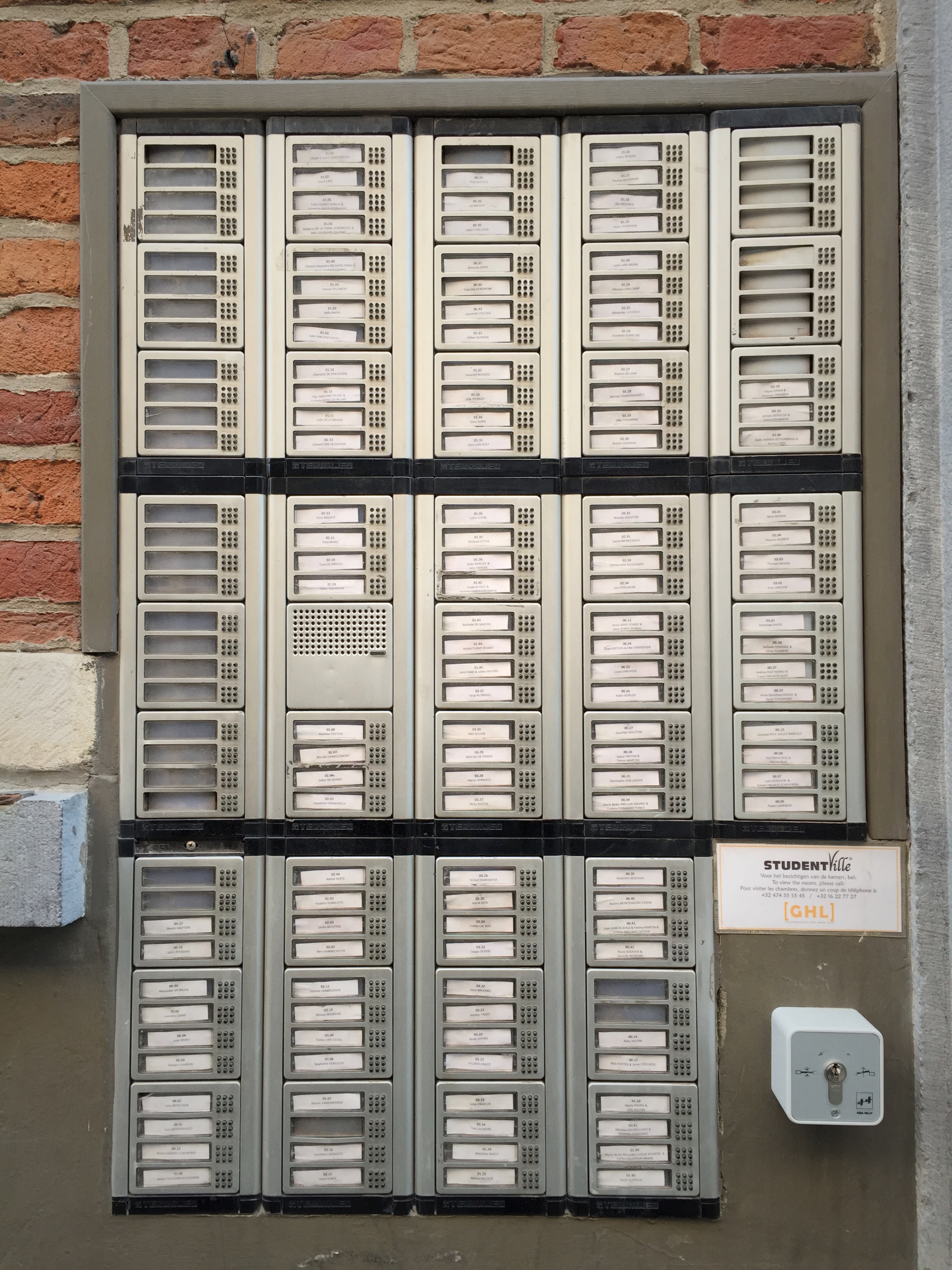 In een studentenstad kom je al eens een voordeur tegen met meerdere bellen. Aan een huis zijn het er een paar, tot soms voorbij de tien, meestal niet veel meer dan dat. Maar hier en daar zitten er kanjers tussen, zoals deze. Niet elke bel lijkt echt een kamer te vertegenwoordigen, maar er zijn wel potentieel 164 bellen (er zijn er 125 met een naam). Als je weet dat een kamer in Leuven toch makkelijk €350 à €450 per maand kost, dan is dat dus een potentieel maandelijks inkomen van €43.750 (125 kamers aan de laagste prijs) à €73.800 (164 kamers aan de hoogste prijs). Nou moe!