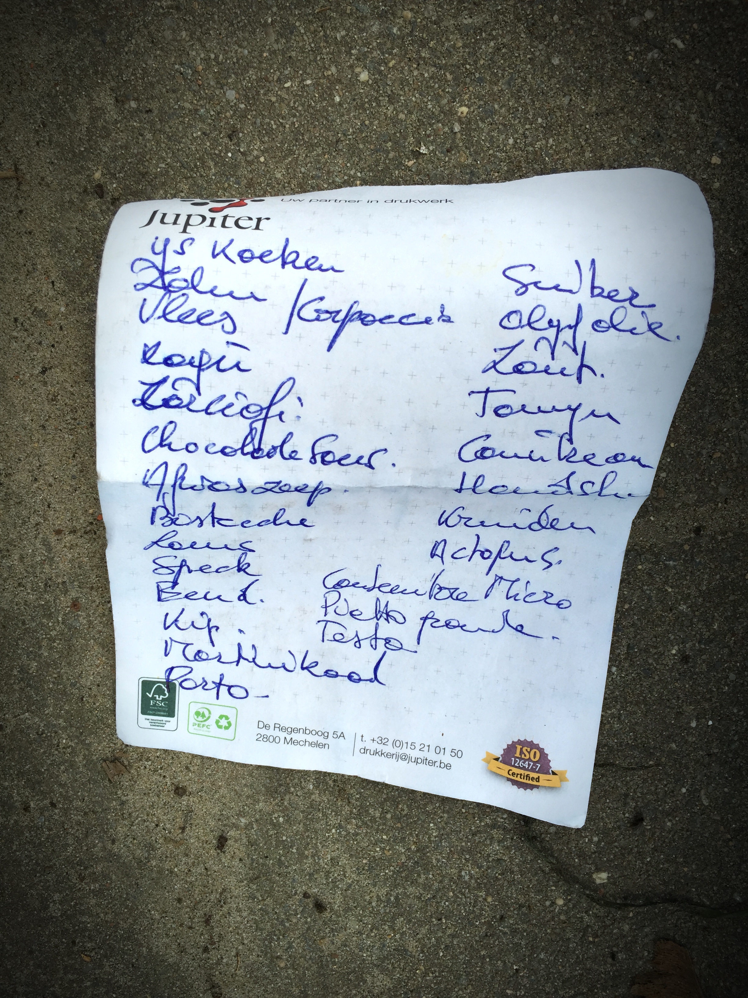 Bizar lijstje, weeral, met nogal wat lastig ontcijferbare aankoopsuggesties. Leuk notitiepapier, dat alvast (zie je die zachte grijze kruisjes, die je anders alleen op nog te snijden drukwerk ziet?). Heeft deze persoon, dit koppel, dit gezin, behoefte aan ijs, aan koeken, of aan ijskoeken? Zalm, dat is duidelijk, tonijn ook, maar ‘vlees’ — eender wat? Verderop staat kip, dat is ook vlees overigens. En lees ik daar nu niet ‘speck’? En zelfs ‘Eend’?