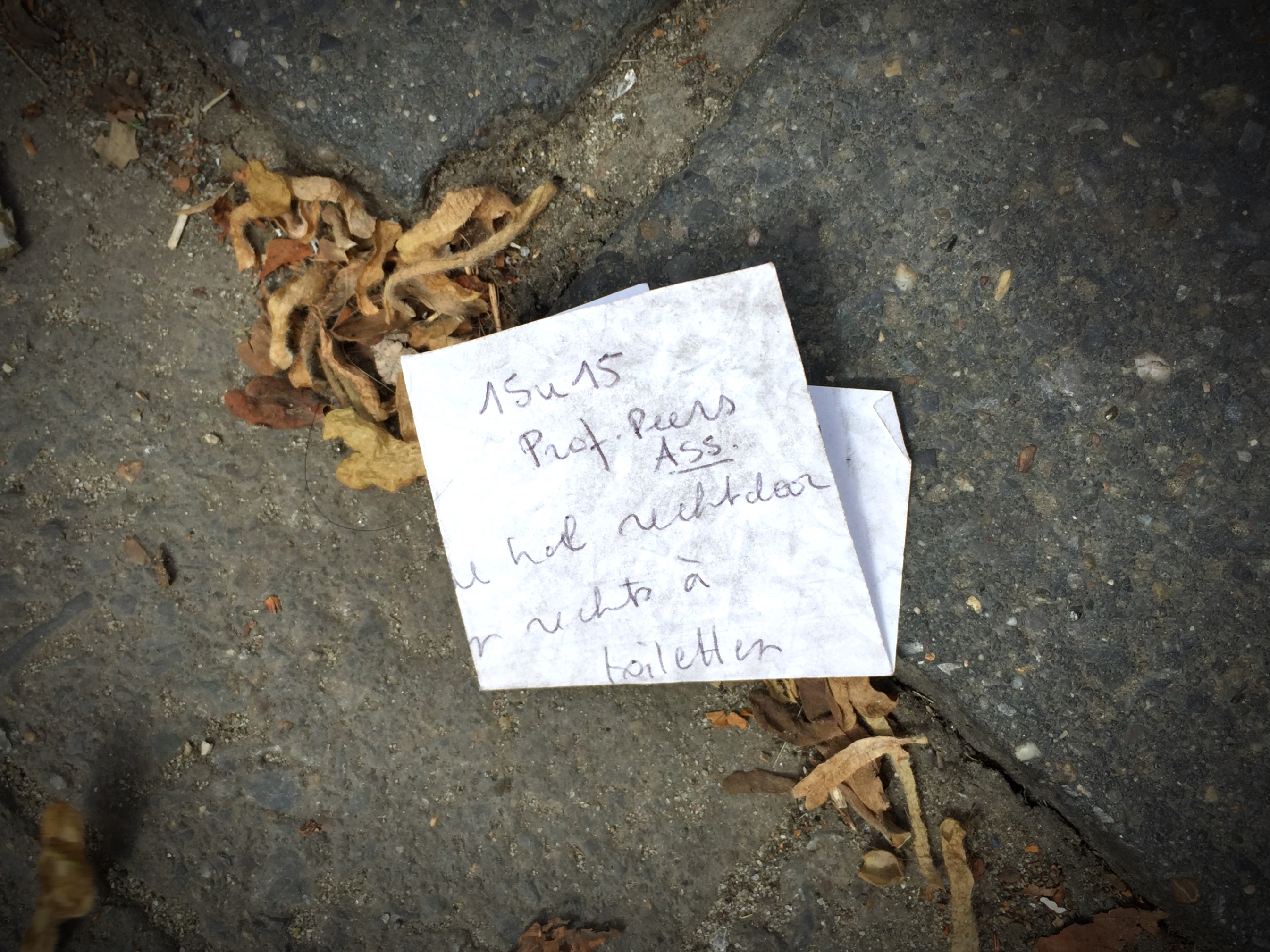 Mooi, zo’n netjes genoteerd richtingaanwijzertje. Om kwart na drie in de les zijn bij (de assistent van?) professor Peers. Of misschien gaat het niet om een les, maar eerder om een afspraak bij de dokter: professor Peers is specialist sportgeneeskunde en sportrevalidatie. Doet ook aan ‘extracorporele shockwave therapie’. Hm, dan zou ik inderdaad ook wel even noteren waar die toiletten zijn.