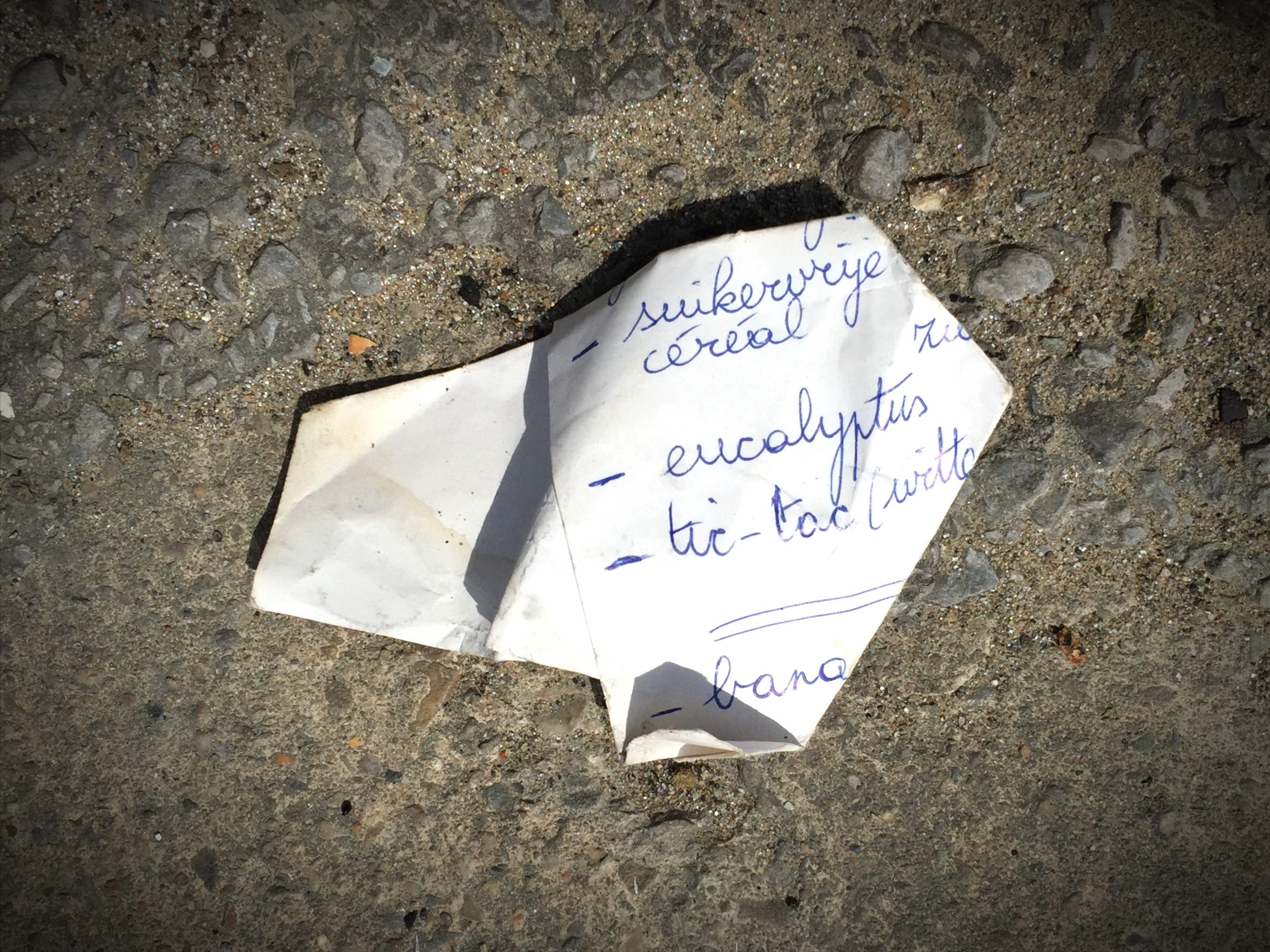 In een ietwat schools (would-be) schoonschrift staan de bananen met dubbele streep van de rest gescheiden. De rest zijnde: suikervrije céréal, iets anders dat met ‘zie’ of zo begint, eucalyptus, en ook Tic-Tacjes — maar het moeten wel degelijk witte zijn, de echte dus. Met suiker dus.