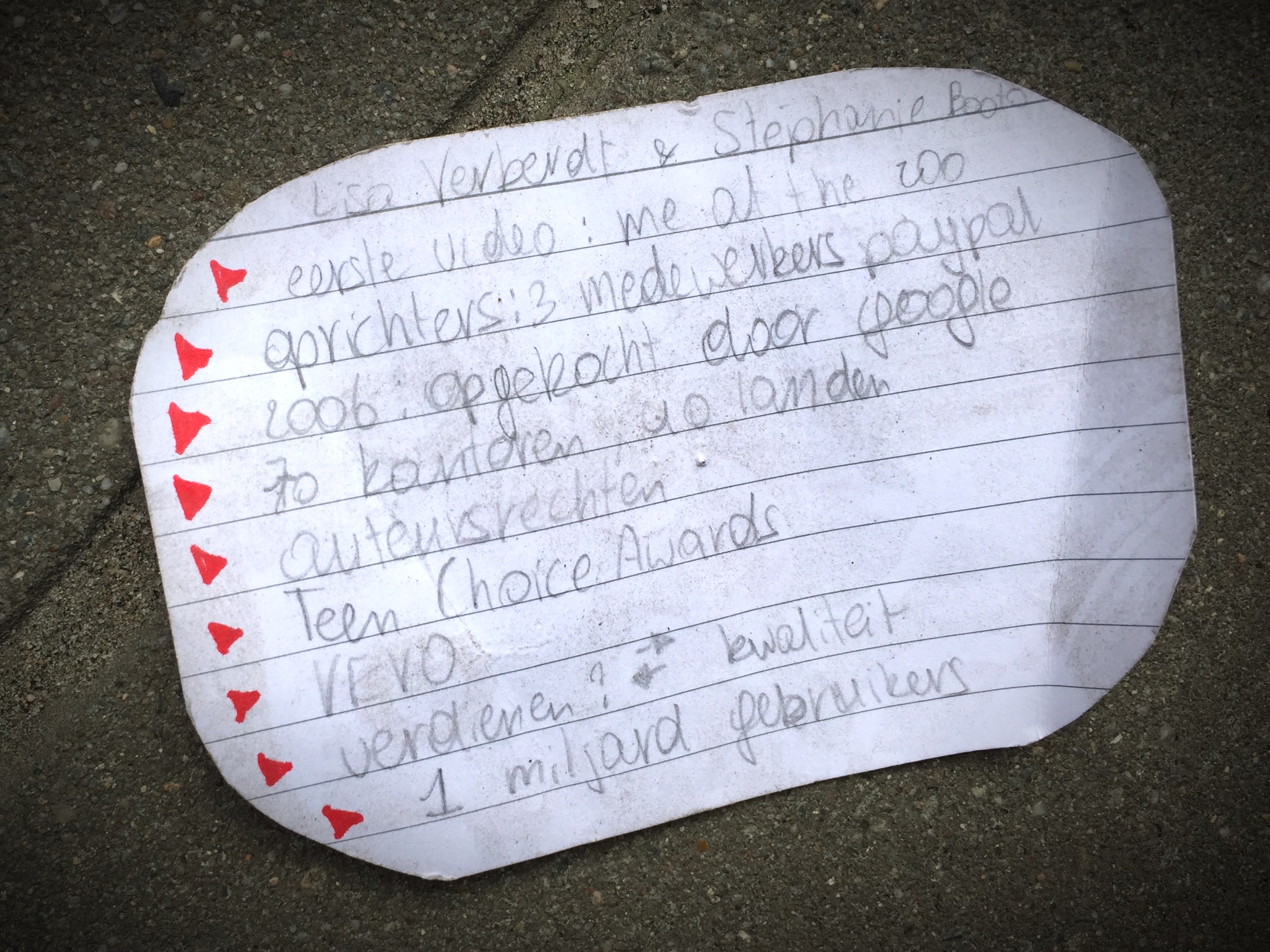 Papiertje van Lisa en Stephanie voor een spreekbeurt over YouTube. Hopelijk hebben ze hun onthoudbriefje pas na de spreekbeurt verloren.