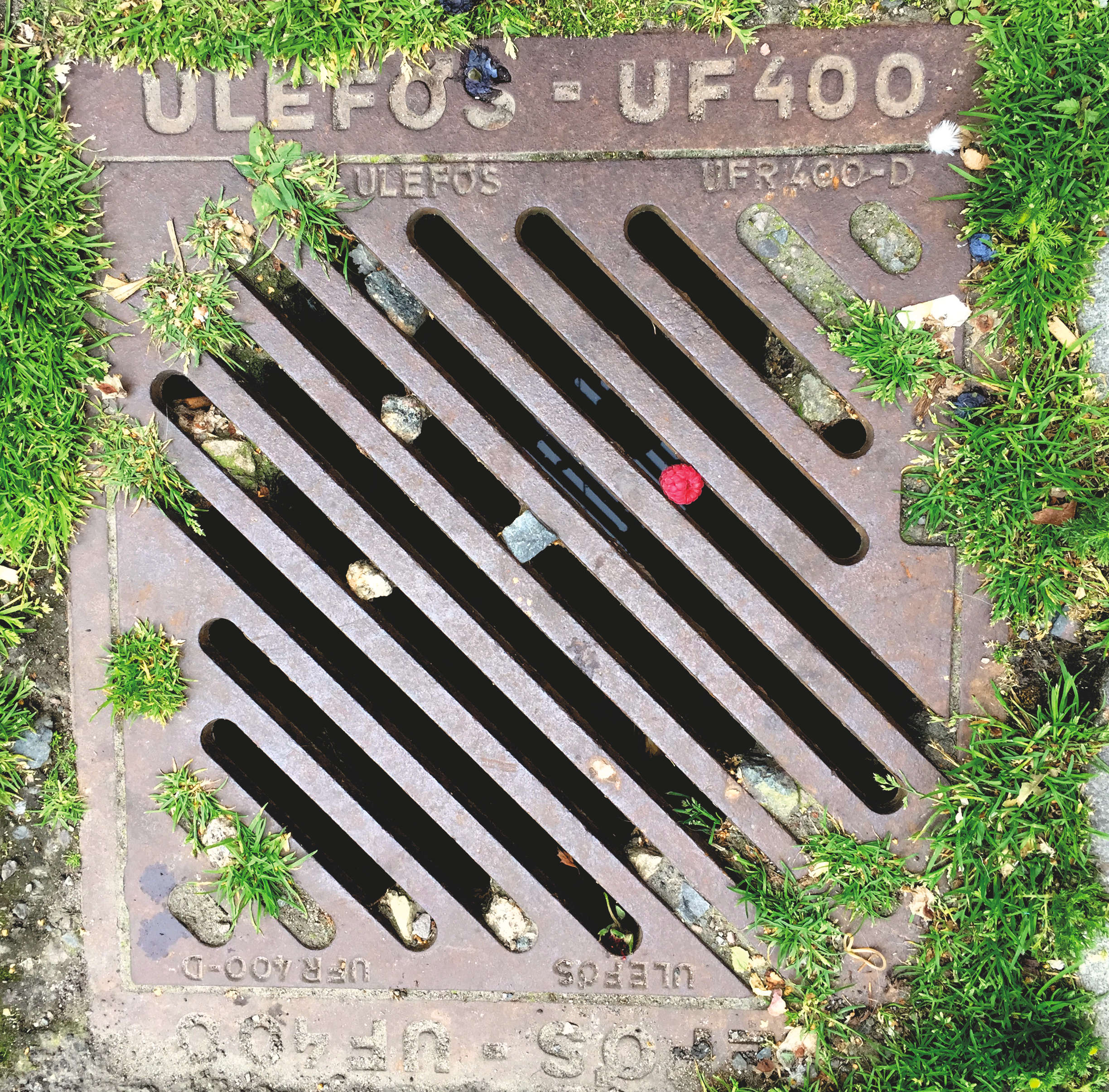 Stilleven met afwateringsrooster en framboos. Ook present: elastiekje, blauwe bes, peuk, donzig wit pluimpje. En natuurlijk grassprietjes en keitjes — wat je al niet ziet als je eens naar de grond kijkt.