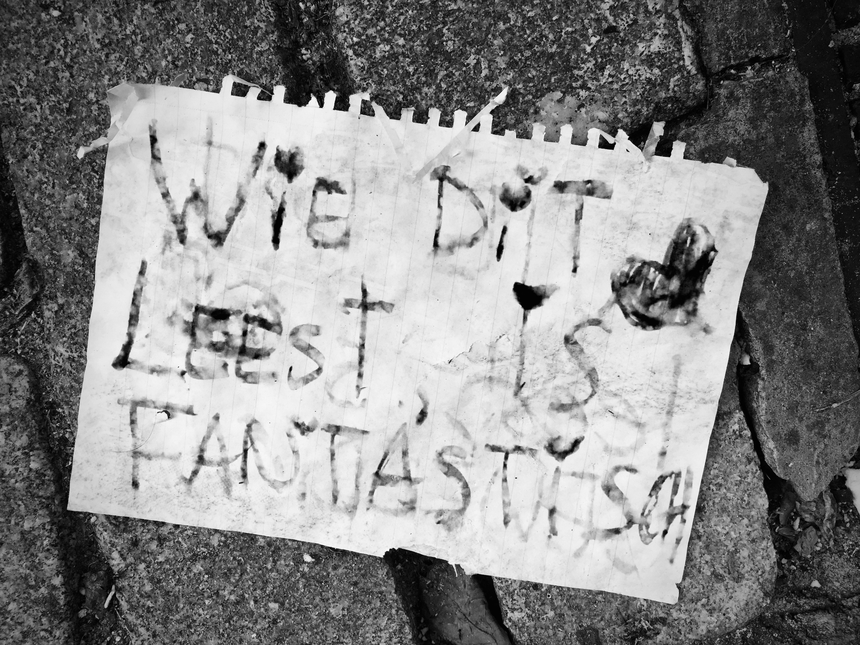 Dit is anders. Hier is iemand aan het werk die met de boodschap “Wie dit leest, is fantastisch” de aandacht van de voorbijganger wil trekken. In Groundtext #48 komen we ook te weten wie het is. Spannend. Trouw aan mijn basisregel heb ik dit papier niet opgeraapt. Nochtans is er duidelijk aan de achterkant iets te lezen, misschien staat er zelfs zoiets als ‘draai dit om’. Ook dat wordt in Groundtext #48 duidelijk — daar ga ik eindelijk eens oprapen, vastnemen, omdraaien.