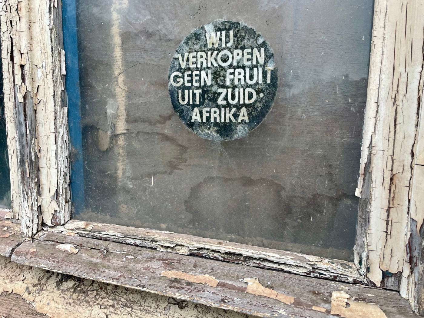 De tijd heeft eraan gevreten, aan de sticker en aan het raam. Aangezien in Zuid-Afrika de eerste ‘niet-raciale, democratische’ verkiezingen – de aanhalingstekens duiden op een zeker voorbehoud voor de terechtheid van die adjectieven – georganiseerd werden in 1994, neem ik aan dat deze sticker inmiddels minstens zo oud is, wellicht veel ouder. Goed spul, die lijm! Plakt goed! Blijft plakken!