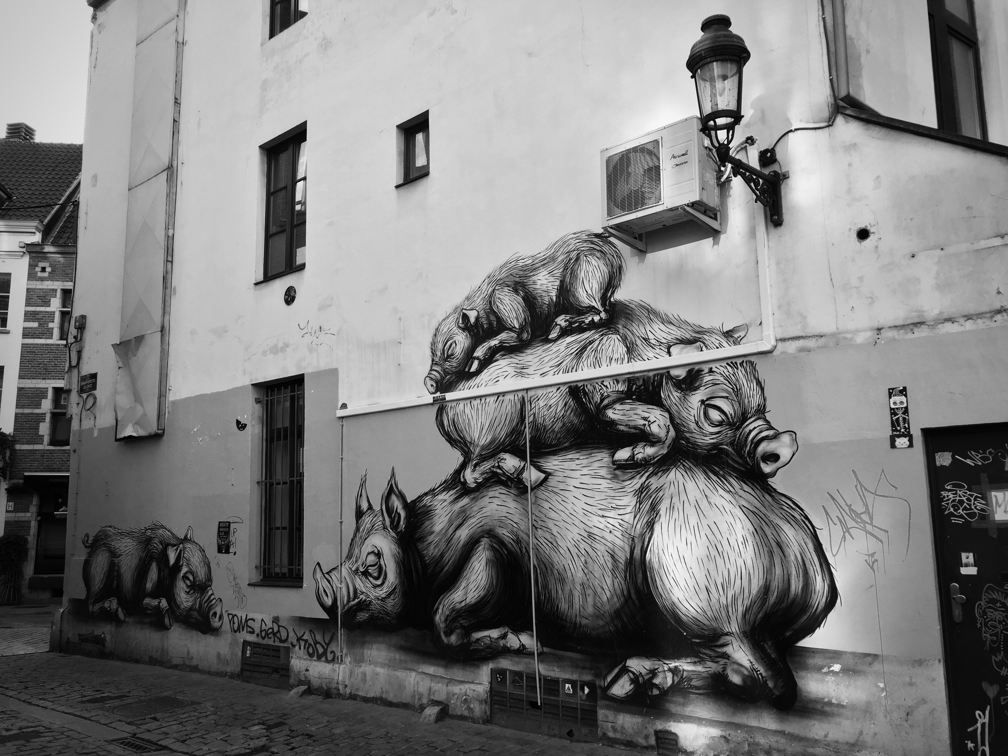 Requiem voor de zwijntjes. Deze muurtekening, zoals gefotografeerd op 7 december 2015, is deze week verwijderd. De muur moest gerenoveerd worden, en dat kon blijkbaar niet zonder de tekening te verwijderen.